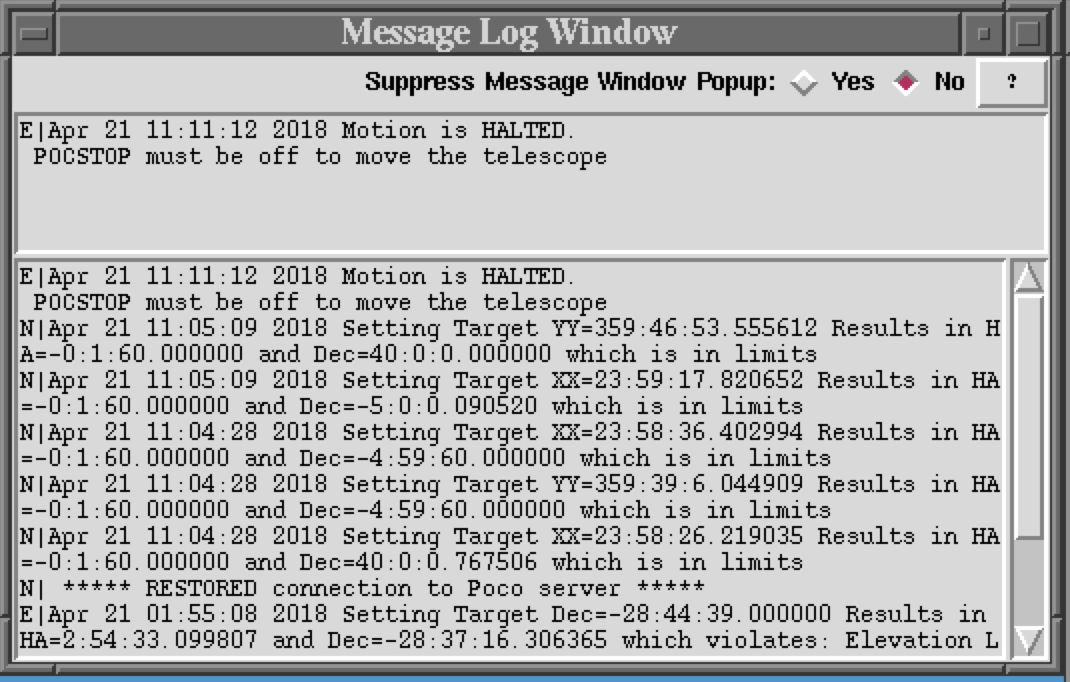 POCO's Message Log will show any messages or errors from the telescope pointing and tracking control software. Most messages are routine, and don't require any attention, but if there is an error the GUI will beep and appear if it had been minimized or closed. You may Suppress Message Window Popup by clicking on the Yes radio button in the top bar, but this is not recommended, because if POCO thinks a message should be seen it is something that likely affects your ability to acquire or track the target. The errors are more or less understandable to astronomers, but contact a telescope technician or support astronomer if you can not discern what the issue is.